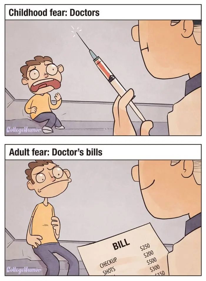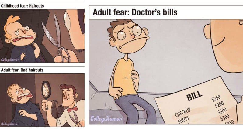When you’re a kid, you think you’ll grow up to be big and brave, and never be afraid of anything! However, as you get older you realise that there will always be things you’re afraid of, it’s just that your childhood fears are different from your adult fears. For instance, when you’re a child, you might be afraid of going to see the doctor in case they gave you a shot or some nasty medicine, but as an adult, the only thing scary about the doctor’s office is the huge bill you’re landed with as a result. So, check out these seven childhood fears versus adult fears, as drawn by Dave Mercier for College Humor.