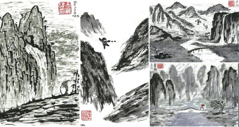 Samuel Peck has just recently expanded his talents and jumped into the world of Chinese ink landscapes. He likes to paint these landscapes in the traditional way, using a calligraphy brush and ink, but occasionally he uses fountain brush pens loaded with fountain pen cartridges, as he sometimes works on his art while out and about, and the latter option is much more portable. Peck's landscapes do have a twist, however. He has inserted some of his favorite childhood characters, such as Totoro and various pokemon, into the paintings. This gives them a fun, whimsical feel and makes them just that little bit different from traditional Chinese landscapes.