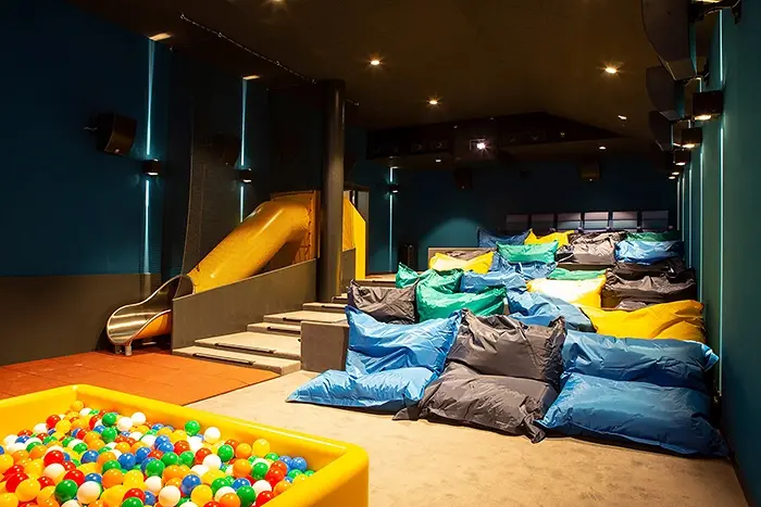 In addition to the VIP bedroom with double-beds, the Swiss cinema also has other VIP bedrooms with different amenities. This includes this VIP room with double sofas with pillows and side tables. Kids can also experience the VIP treatment in the Children’s Cinema with lots of huge bean bags, a ball pit, and a slide. Each VIP ticket for kids costs $14.