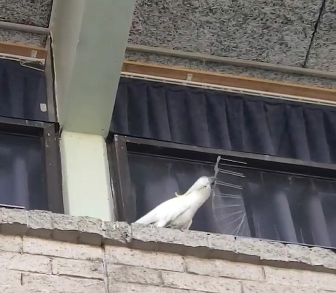This cockatoo made a bold statement against a mall by picking out the anti-bird spikes installed along one of its ledges