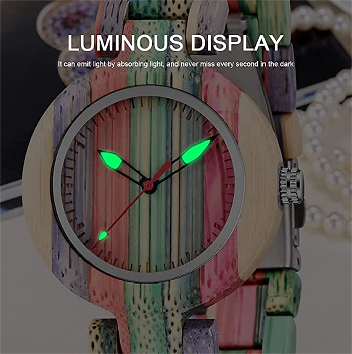 This colorful wooden watch features Japanese quartz movement to provide accurate time. It comes with stainless steel crown and folding clasp. The hour, minute, and second hands are luminous so you can tell time even in the dark. It also includes a tiny calendar window. And the clock face is protected by mineral glass. It is powered by 1 LR44 battery (included) and comes in men and women version. One happy buyer wrote: