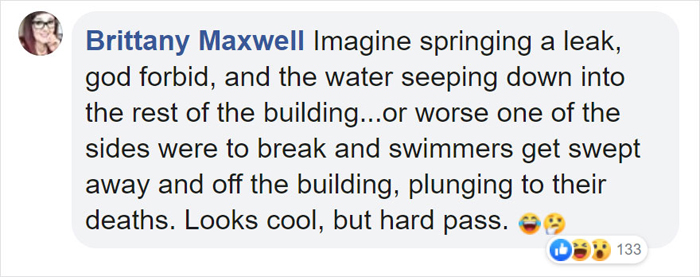 Furthermore, the design of the 360-degree infinity pool stirred a lot of questions. High winds would surely challenge the water surface and the structure of the pool. Without any buttress or any type of underprop, how can it sustain the weight of the water? More importantly, how can anyone reach the pool at the top of the building?