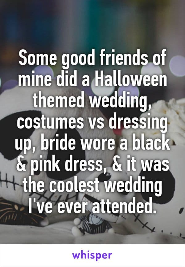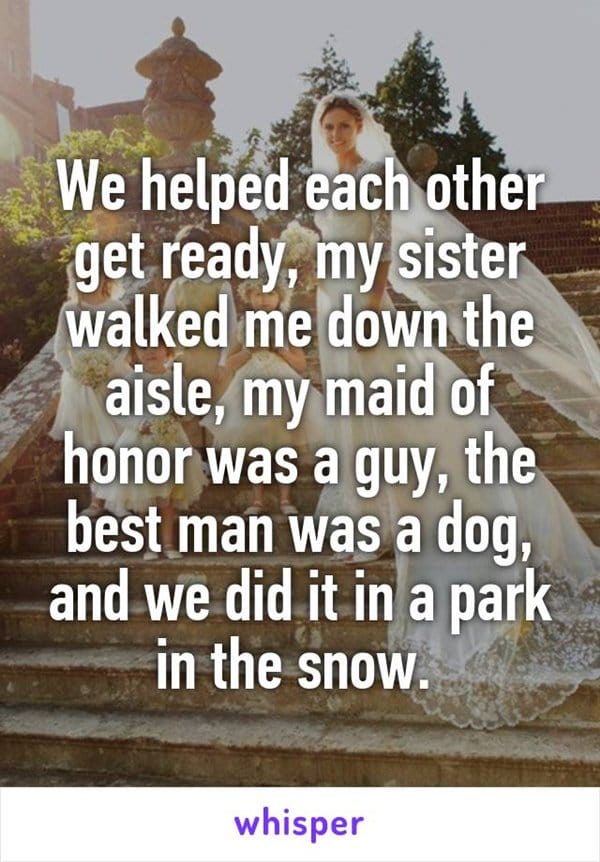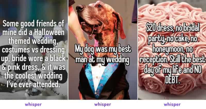 If someone asked people to picture a wedding, most folks would have a very similar image to one another. Typical features might include a bride in a white dress, a groom in a tux or formal suit, a big church wedding, a towering cake and bridesmaids dressed in matching taffeta. But, a wedding doesn’t have to look anything like that… it can be whatever the happy couple wants to to be. Most people are much more accepting of differences these days, but having non-traditional elements to your wedding still often incurs some raised eyebrows. That’s why it’s great to hear from or about these thirteen couples who had non-traditional weddings and don’t regret it one bit. Take a look!