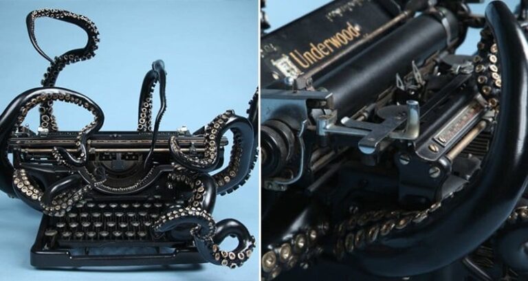 The tentacles added to the typewriter are sculpted with bronze, and everything but the suckers are painted black, which matches in well with the rest of the Underwood. Brown has created lots more awesome sculptures, so if you like this, then be sure to check out more of her work! Now, let’s take a look at this ‘type-topus’!