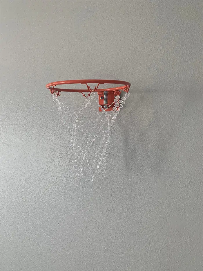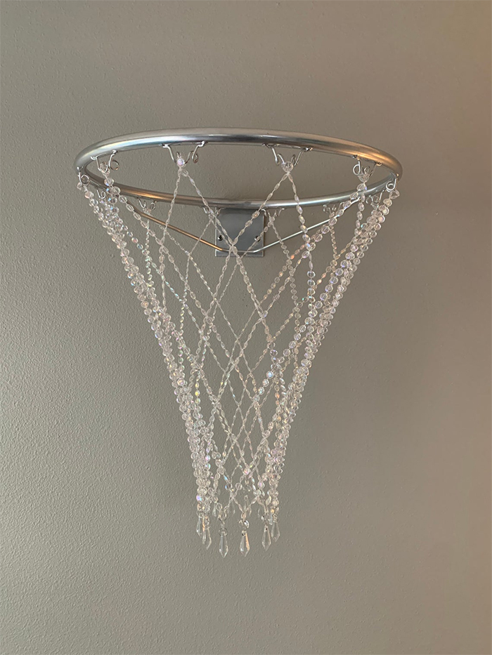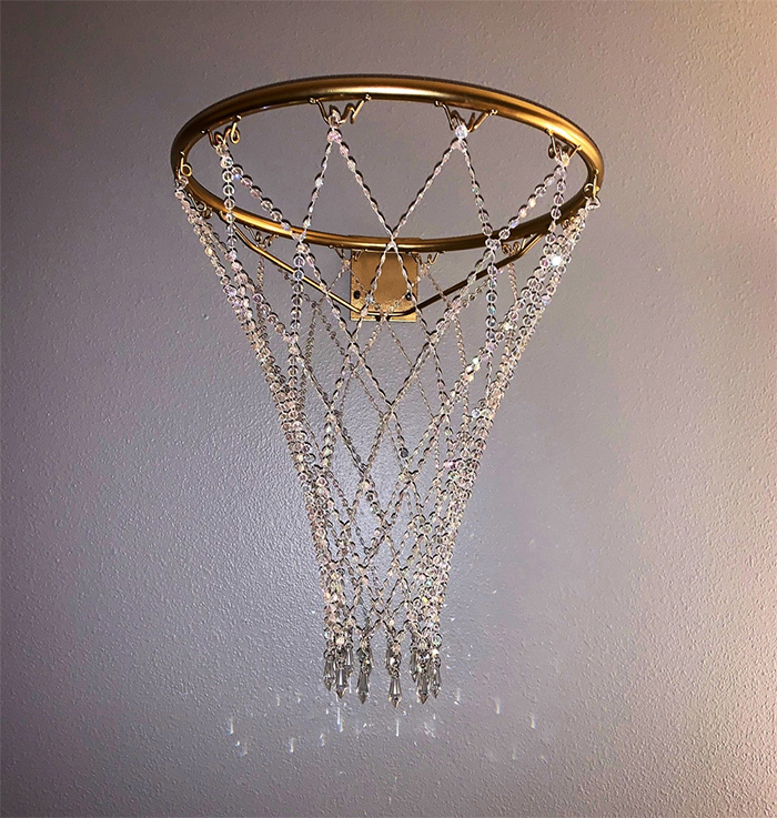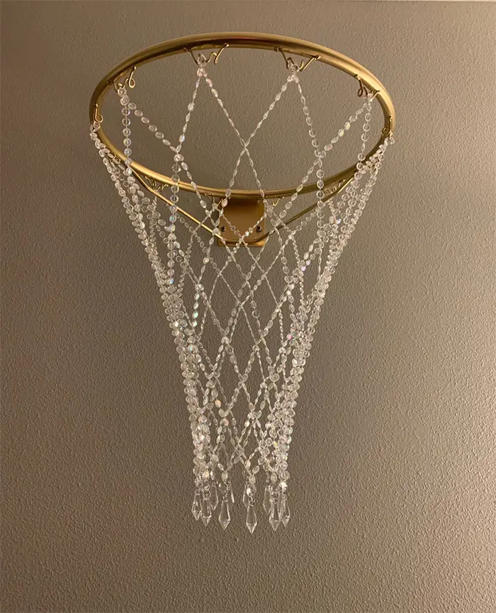 This crystal basketball hoop chandelier features a glossy rim and a sparkling net. The 18-inches diameter full-sized basketball rim is available in 6 lustrous finishes including gold, silver, rose gold, black, white, and orange. So, you can choose the right color to complement your interior color scheme. The hand-woven net is made of iridescent gems with 12 teardrop icicle prisms hanging at the bottom. It hangs approximately 22 inches from the rim and sits 20 inches from the wall. Remember that this is a piece of décor and is not intended to be used as a basketball hoop. So yeah, you could only look at it in awe and you should never shoot a ball into the basket.
