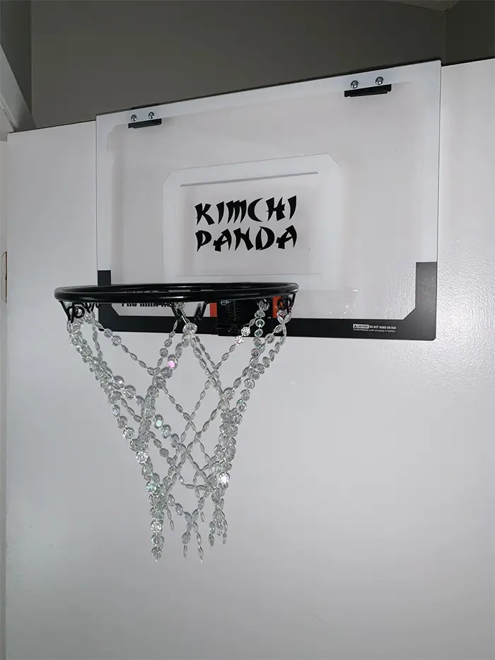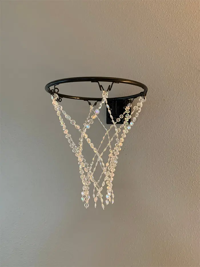 This crystal basketball hoop chandelier is also available in a smaller version. The mini version has a rim measuring 9 inches in diameter with the glittering net hanging approximately 12 inches from the rim. Both versions don’t come with a backboard. You simply mount the metal bracket onto the wall using screws or nails. But if you want this hoop with an included backboard, you can get the mini version with backboard that you can also personalize. The backboard measures 18 inches x 12 inches and can be customized upon request.