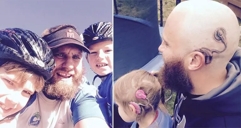 It’s heartbreaking for a parent when their child is born with, or develops, a disability or illness. Not only do you worry about the issue itself, but you also worry how they will cope and be viewed by others. New Zealand native Alistair Campbell is here to show us parenting done right. His daughter Charlotte suffers from extreme hearing loss and received her first implant aged just 4. He decided to take action in making her feel better about herself by getting an implant tattooed on his head, and the resemblance is awesome! You’ll notice another cool dad at the bottom of this post did the same wonderful thing! Yay for people!