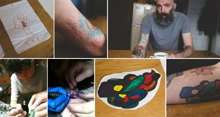 Totally devoted Ontario dad Keith Anderson adores his son Kai and has managed to find an incredibly unique way of preserving his childhood forever. He has covered his right arm with his sons drawings every year since the boy was 5!