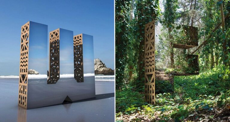 Huge monolithic letters were created from wood and mirrors to show that design is everywhere you look, and is easily accessible even though much of it goes completely unnoticed. Due to their reflective nature, the giant letters can almost go unseen at times until the viewer looks closely. The agency felt that this concept was symbolic of all manmade things, as every single one contains an element of design.