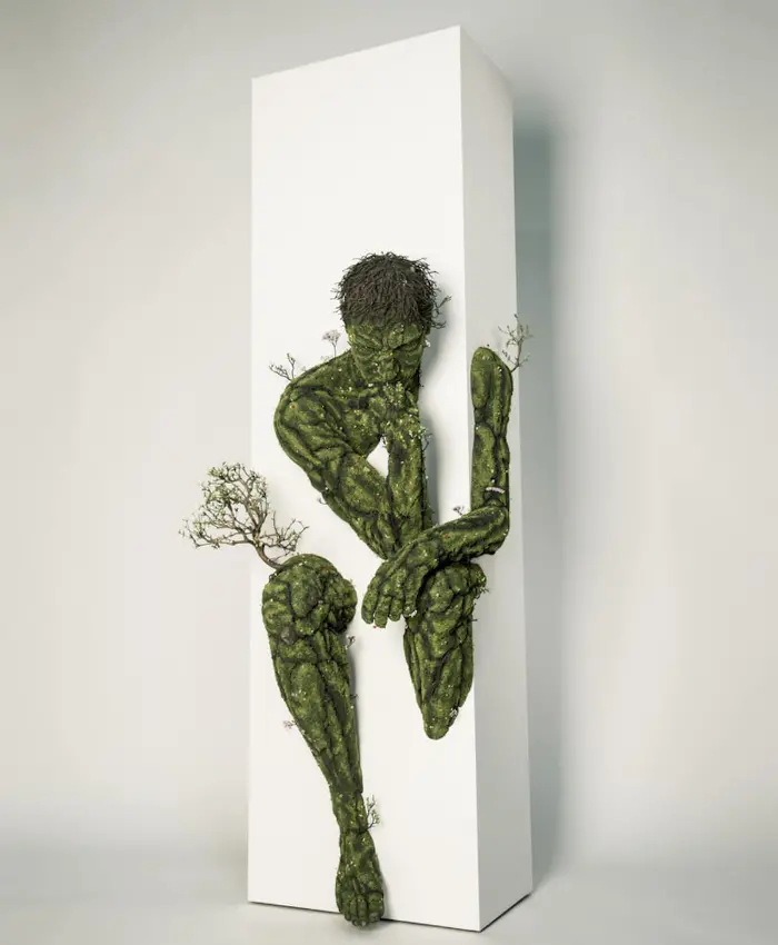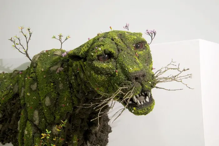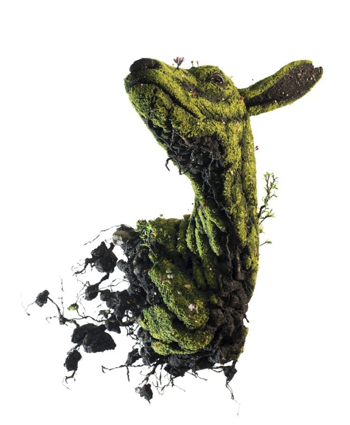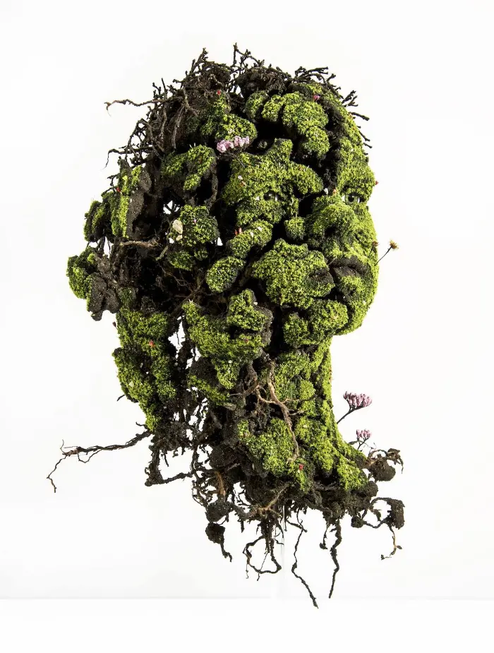 The modern artist, Emeric Chantier, has quite a wild imagination. What he does is to imagine people as well as animals as plant sculptures — and they all look surreal. With a combination of natural elements with faux greenery, Chantier makes forms of faces with a luxurious appearance and some twigs emerging from them.