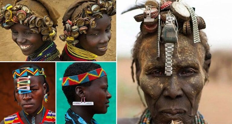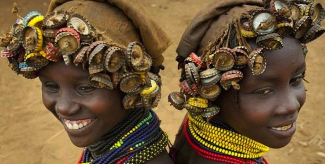 We've all heard the saying 'one man's trash is another man's treasure', but for this Ethiopian tribe, it's quite literally true. The semi-nomadic Dassanech people, who live in Ethiopia's Omo Valley, don't like to let anything go to waste and will collect trash and any other discarded items to turn into jewelry and headdresses. Eric Lafforgue has spent several years photographing these people and has some amazing shots of these elaborate creations. One of the most popular materials to use are old bottle caps, which are easy to acquire from bars in Omorate. On his website, Lafforgue writes,