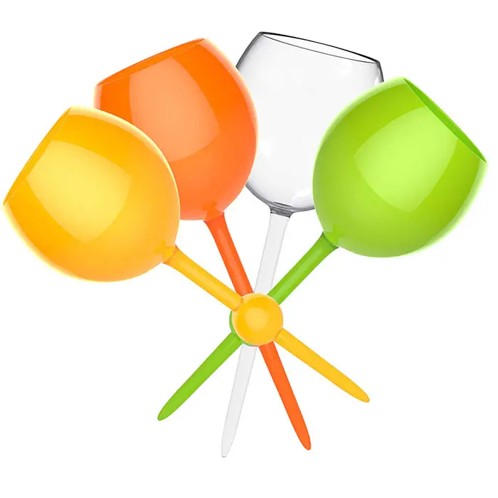 So, what makes these beach wine glasses unique? Unlike the traditional wine glasses with round, flat bottoms, these floating wine glasses have dull pointed stakes built into them. So you can simply stick into the sand. The stem is accented with a bulb that firmly keep in place so you don’t have to worry about spilling.