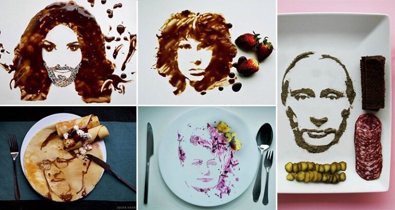 Jolita Vaitkute, an 18 year old artist from Lithuania creates portraits of famous people with just foods such as ketchup, cheese, spices, chocolate and more. Taking her inspiration from Instagram photography among other things, food art is her big passion in life. In fact she loves art in general and doesn't mind which materials she uses to create a piece so long as it is made. On average her portraits take 2-6 hours to complete.
