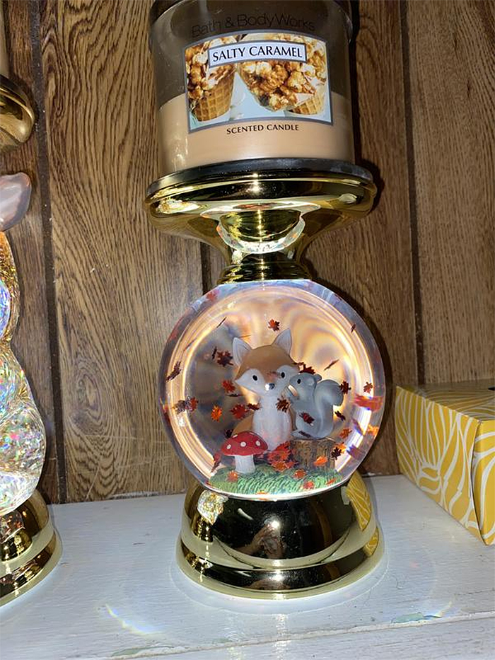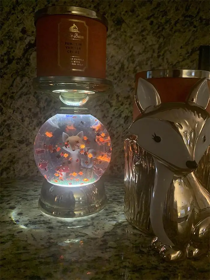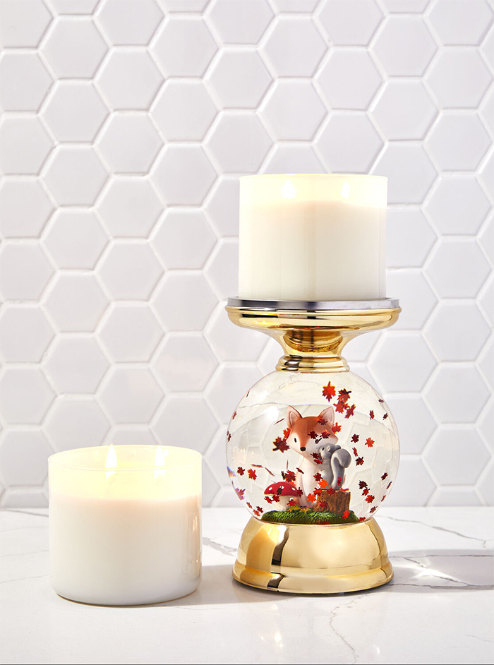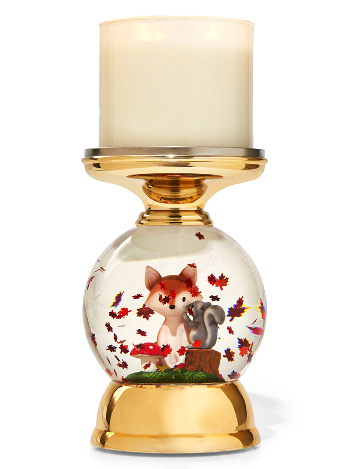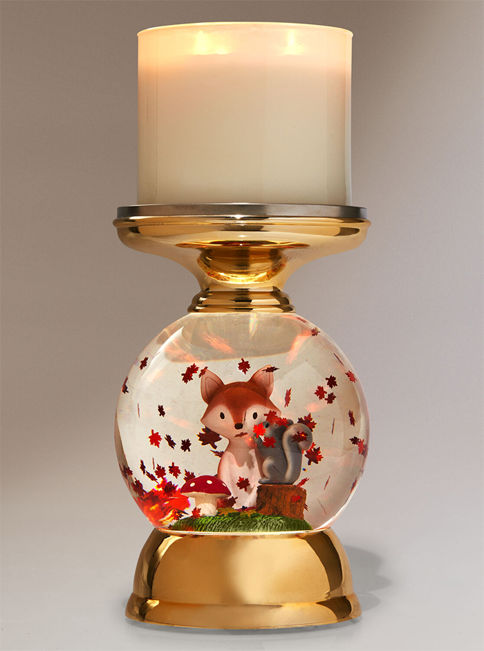 This charming candle holder features a pedestal to securely hold any standard 3-wick candle. Of course, fall-scented ones are highly recommended to match the design. But its most alluring feature is the water globe underneath the holder. Inside the water-filled spherical glass are cute mini figures of a fox and a squirrel hanging out on a grassy ground. Next to the fox is a toadstool while the squirrel stands on a tree stump to create a woodland setting. Furthermore, it has swirling leaves to emulate the falling leaves of autumn.