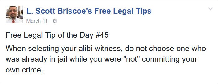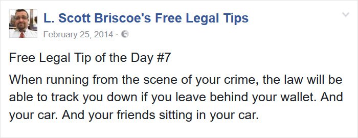 If you’ve been in the business of criminal law for the past 19 years, you can bet that you’ll have some pretty crazy stories! L. Scott Briscoe is a lawyer from West Virginia who, in his spare time, likes to post free legal tips to Facebook that are based on things his clients have really done during the time he’s been practicing. These tips seem like common sense at its most basic, which really makes you wonder at the people who must have actually done these things. The mind boggles! So, check out these thirteen hilarious free legal tips based on one lawyer’s real experiences!