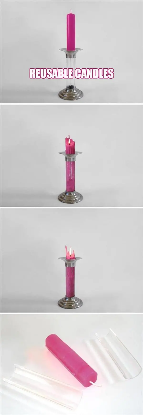 This reusable candle once lit, will melt wax and that wax will poor down into the tube below. After a little time, the wax in the tube will be hard enough for you to pull out and use again.