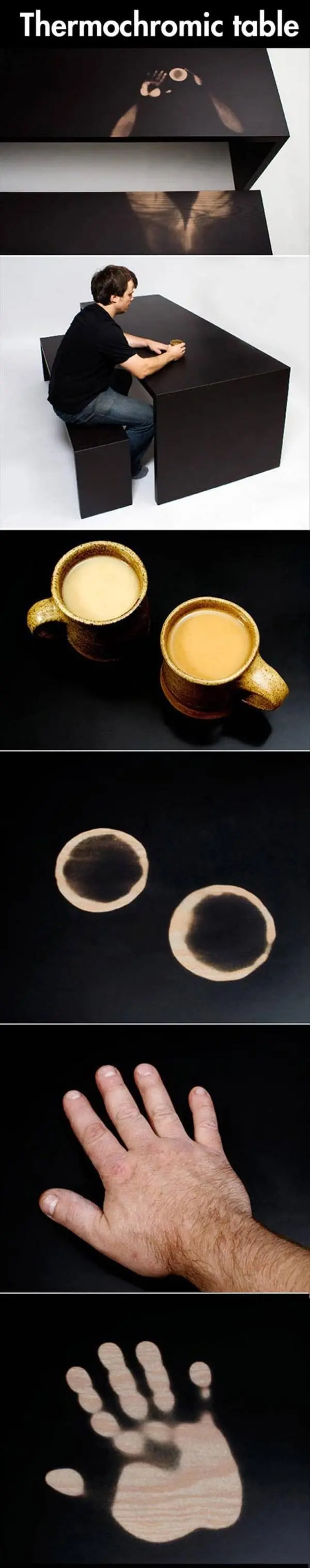 This thermochromic table reacts to anything warm/hot that touches it. This certainly will get the conversations flowing and probably have people trying to print all sorts of ‘designs’ on it.