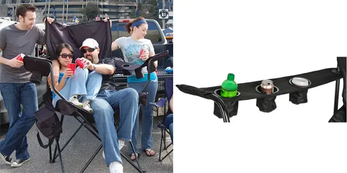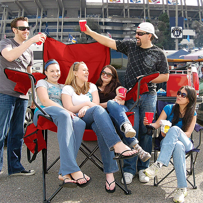 What’s more, this giant folding chair has 6 cup holders because there’s no such thing as too many cups of beer. Plus, it includes a removable cooler to ensure that you have perfectly chilled drinks within arm’s reach. You don’t even have to leave your seat if you need more drinks. The hammock-style seating is made of weather-resistant fabric. So, you can use it anywhere outside without having to worry about it getting damaged by harsh sun and rain. Additionally, ts non-skid foot pads keeps the chair securely in place.