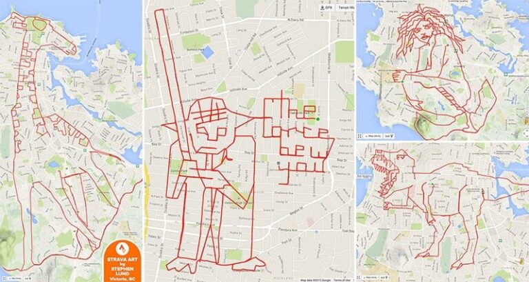 As far as hobbies go, Stephen Lund's is fairly unusual, but at least it keeps him fit and gets him out of the house! Combining art and cycling, Lund draws giant doodles using 'Strava', a GPS tracking app, by riding his bike in very specific routes around his home town of Victoria, Canada, and sometimes other parts of British Columbia. He rides an average of 70km a day, creating various doodles, but his longest drawing was of a mermaid that reached a total of 220km. We're not sure how he finds the time, or the energy, but we must admit that these giant doodles are awesome! Take a look!