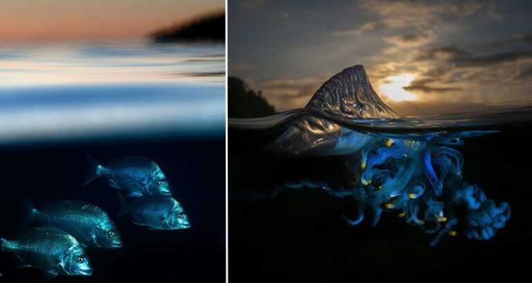 "For me one of the most wondrous parts of any dive is the moment that the water engulfs my mask as my head slips below the surface. I think it’s the suspense of the unknown of what lies beneath, the transitional part of moving from one element to the next that feels so magical and the thought of what alien creatures I might encounter. That is what draws me to taking half over half underwater images. I try to convey to the viewer that majestic feeling in a picture format. It’s maybe the best way I can communicate to a non-diver what it’s all about, to marry a wet and unfamiliar world with a dry and more familiar one."