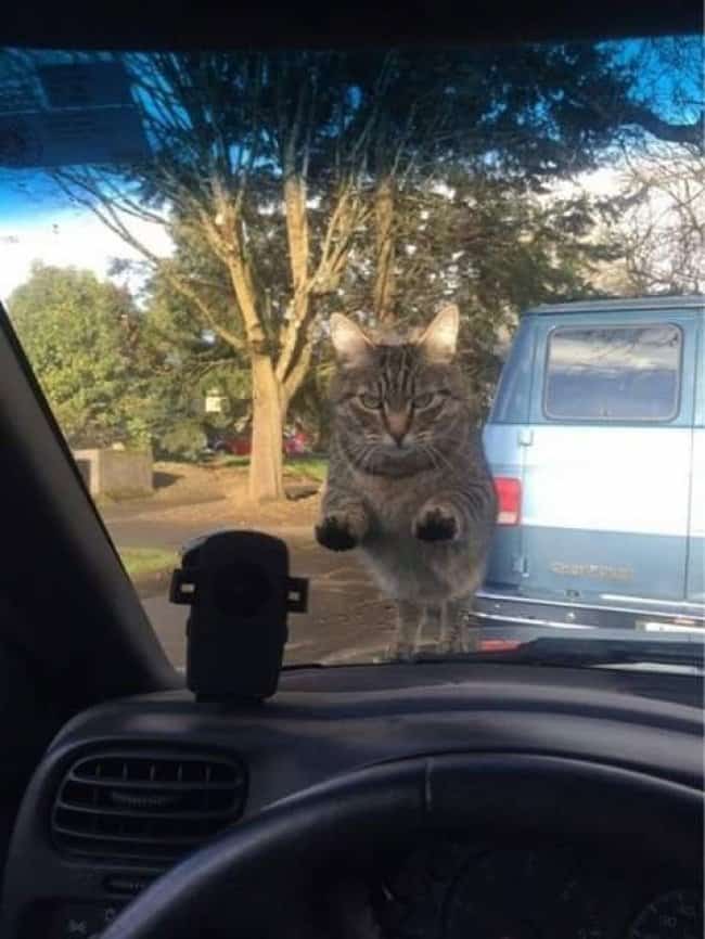 “I’m not letting you pass until you give me my food!”, says the grumpy cat.
