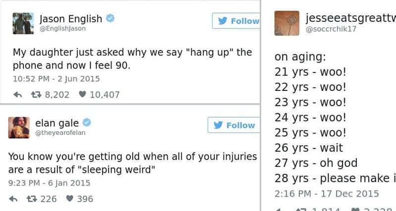 As a society, we’re completely obsessed with youth. Take a look at any magazine cover and some impossibly beautiful photoshopped and incredibly young model will be staring back at you. And don’t get us started on all those little facial enhancements you can get done during your lunch hour. What’s so wrong with aging anyway? Everyone does it. It’s inevitable. So why is getting a few wrinkles and gray hairs such a big deal? Check out these hilarious tweets about the struggles of getting older and see what ones you can identify with.