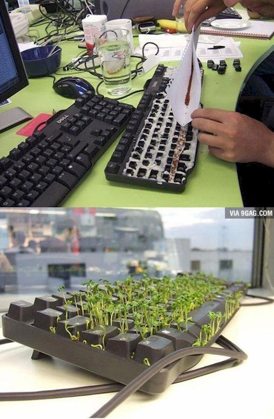 This damp paper and sprouts in the keyboard prank takes time and effort, but it’s worth it!