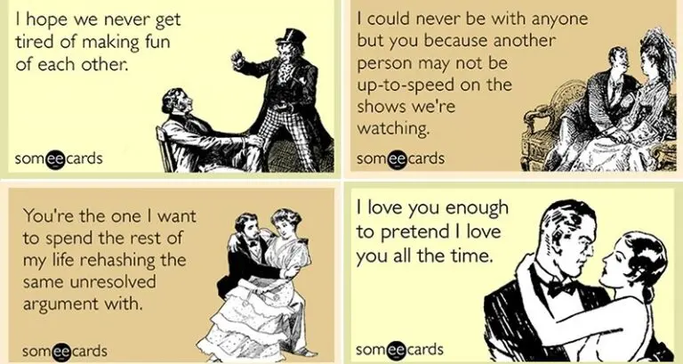 If you’re in a happy relationship, but find the whole “hearts and flowers” thing to be nauseating nonsense, then you’ll love this selection of totally honest love cards. These funny graphics come from the people at Someecards and, unless you’ve been hiding under a rock for the past few years, you will have seen other eCards of this style popping up on your social media feeds. These cards are a great way show love in a unique way. So, own it, and send one of these to somebody you hold dear!