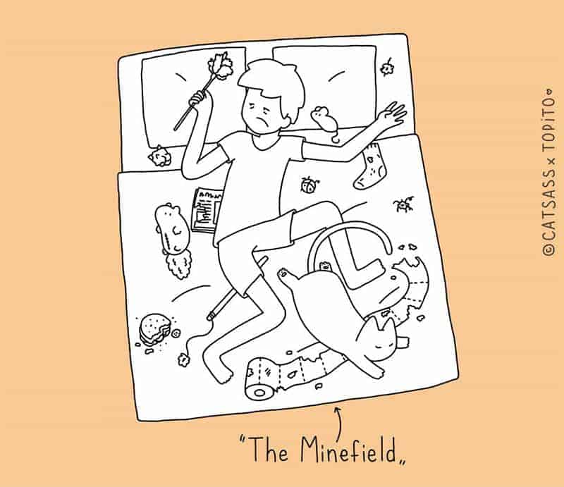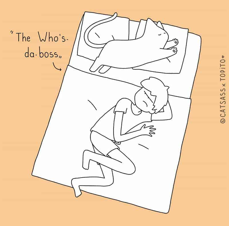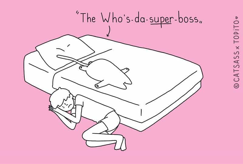Any cat owners out there will know that the little creatures can be the most loving, affectionate and comforting companions, yet also the most annoying. Particularly when they choose to invade your bed in a manner of disruptive, selfish ways. Sometimes things can get so bad that you actually end up sleeping pillow-less or on the floor, or both. But with their loving eyes and soft fur, they will always get away with it. And another thing owners will know is sometimes discipline just makes no difference! Take a look at the hilariously accurate illustrations below and release your frustrations!