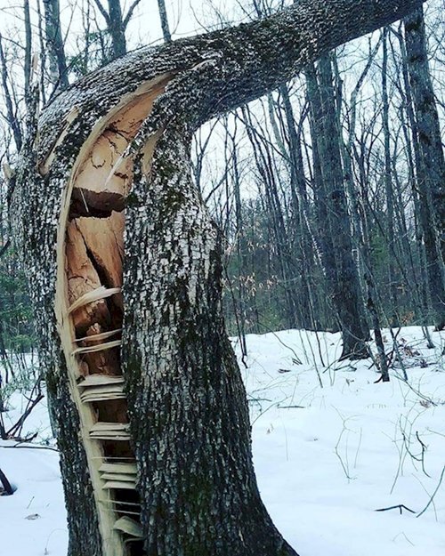 This tenacious tree bent and broke during a storm, but refused to fall!