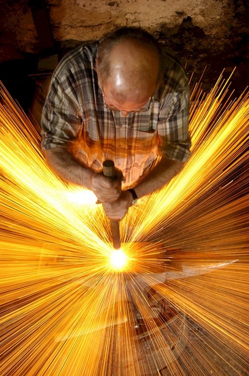 Here's a long-exposure shot of a blacksmith striking while the iron is hot.