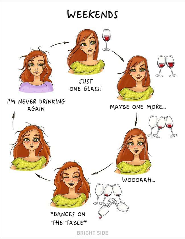 All of us make promises to ourselves that we have every intention of keeping, at the time. Virtually everyone ends up falling by the wayside, however true our original intentions! You know what we mean, like those times you vow to only have one drink when you go out to the club and then get so drunk you can't remember how you got home! Maybe you've promised yourself that you'll lose some weight but those chocolate bars just keep calling out to you? Whatever it is, you'll find plenty to identify with in these 10 illustrations! Take a look!