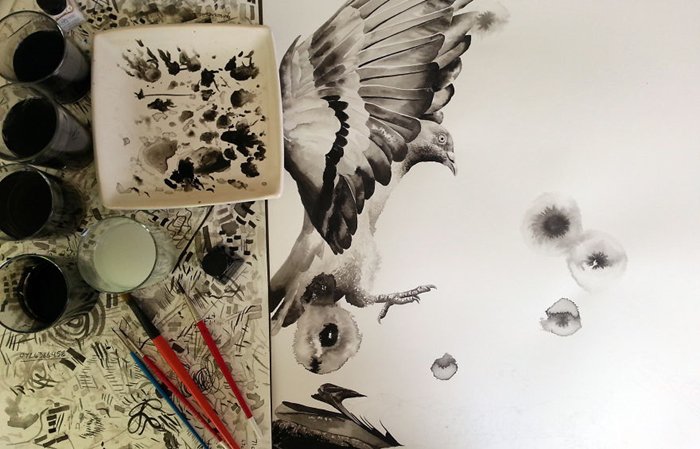 Many people think of pigeons as pests or nuisances, but Gawie Joubert's gorgeous ink drawings might make you think differently. His stunningly detailed black and white illustrations of pigeons will let you see them in a whole new light, as the intelligent and interesting creatures that they are. We love the strong use of black and white here, and the strategically placed ink blots. In reference to his series on pigeons, Joubert wrote…