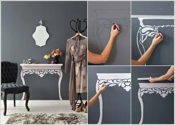 Make a painted table under a free-standing shelf to give the illusion of more space.
