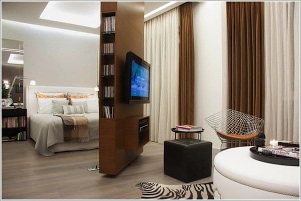 Rotating bedroom divider that doubles as a book and TV shelf.