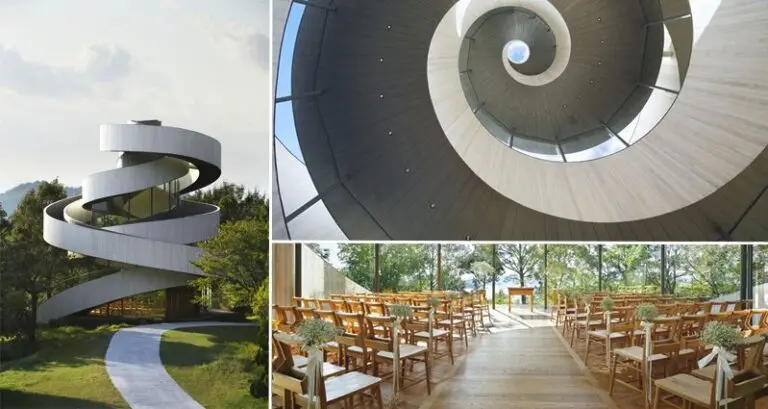 This wedding chapel in the Hiroshima district of Japan is strange, yet beautiful. The structure is comprised of two spirals that meet at the top, and is rather fittingly known as the "ribbon chapel." At first glance, it might appear as though it's a case of style over substance, but there's actually a good reason behind the design being as it is. We'll get to that later! This striking chapel was designed by Nacasa and Partners Architects and is located on the Bella Vista Sakaighama resort. Not only is it a gorgeous building, it also offers guests outstanding views over the ocean. All in all, it seems like an idyllic place to tie the knot.