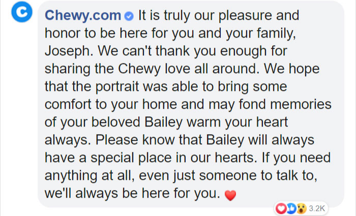 Of course, Chewy noticed the post. In reply, they gave a warm and inspiring message for Joseph.