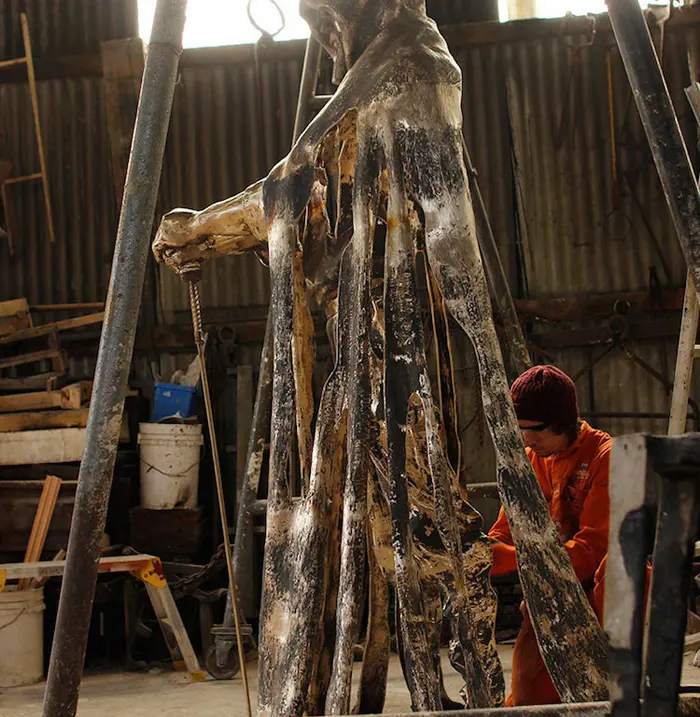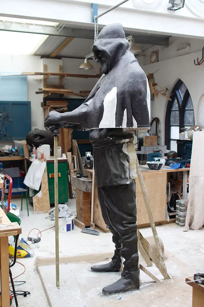 Welsh sculptor Rubin Eynon casting the massive bronze sculpture