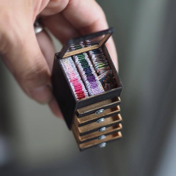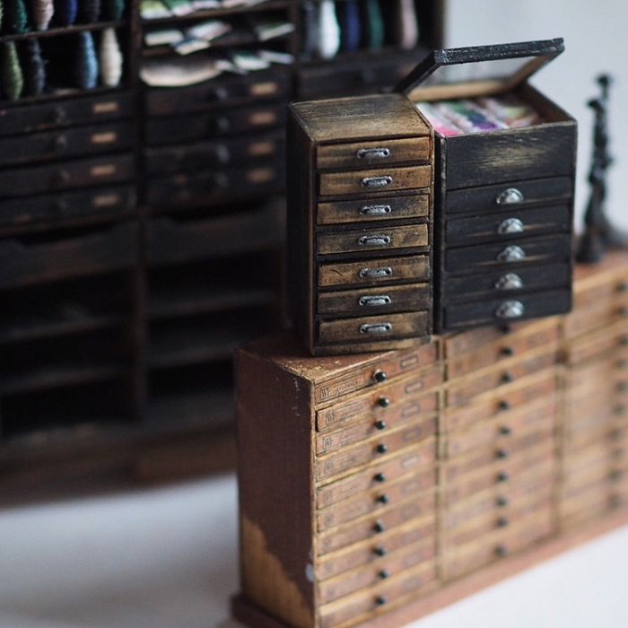 Using her own wit and artistic style, Kiyomi can create detailed handmade miniatures. One of her favorite themes is the 18th-century world. Among others, you’ll see antique cabinets as well as industrial-style chairs. You can also spot some sewing machines, spools of thread, and sewing scissors.