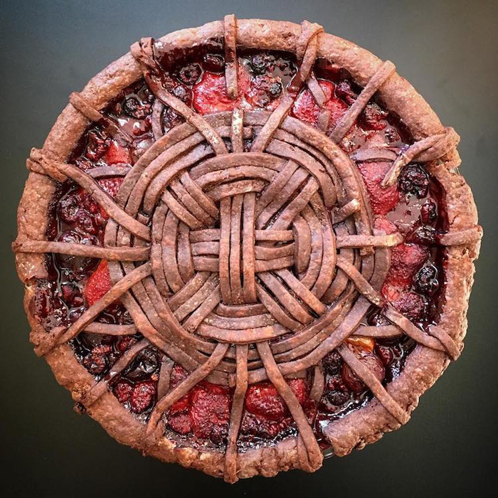 Seattle-based home baker Lauren Ko proves that even pies can transform into beautiful works of art, just like decorative cakes. Although she can’t use icings to craft the surface, she cleverly utilizes strips of dough to create avant-garde crust designs. She adds some twists to the traditional lattice pastry technique by forming crisscross patterns and intricate weaves. Also, she cuts the dough strips in various lengths, thickness and shapes to achieve variations in the patterns. Furthermore, she brilliantly makes use of fruits, nuts, and other ingredients to adorn the surface of her gorgeous art pies.