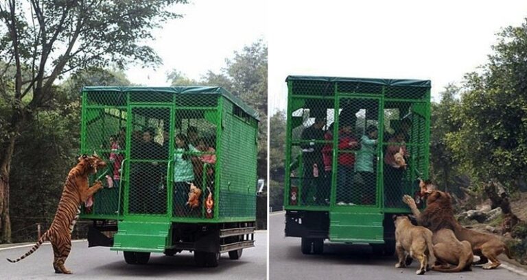 At the Lehe Ledu Wildlife Zoo in Chongqing, China, it’s the humans who are locked behind bars while the animals get to roam around. Visitors can book a tour where they will be locked in a cage in the back of a truck and driven through predators’ enclosures. Raw meat is hung on the sides of the cage, to encourage the animals to come closer. Zoo spokeswoman Chan Liang said,