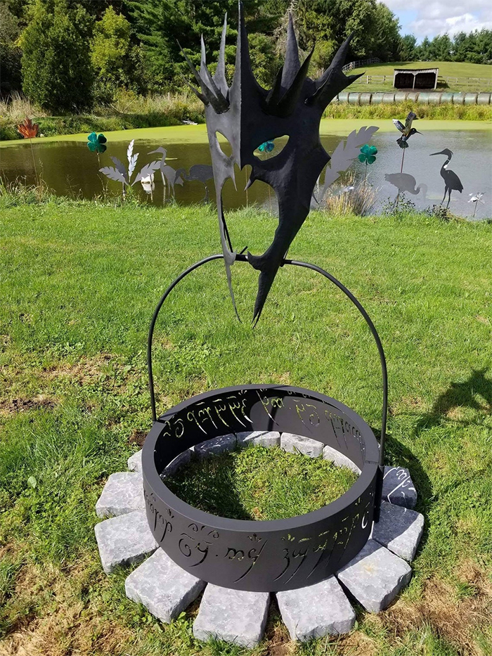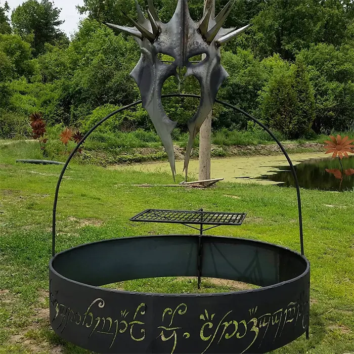 We’ve found another version of the Lord of the Rings fire pit with additional detail. This 16-gauge metal ring measures 30 inches in diameter and 8.5 inches high which is not much different from the previous one. But this version features Sauron’s mask suspended above the pit by a metal arc. With large flame engulfing the mask, it appears as if Sauron emerges from the fire. Including the mask, this pit measures 4 feet 6 inches high.