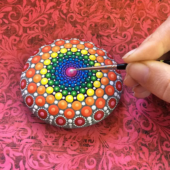 The detail that Elspeth puts into each and every stone is incredibly intricate, but her process is actually quite simple. Equipped only with brushes, paint, and her imagination, this artist completely changes every stone her brush touches. Fascinatingly enough, Elspeth employs a rather unique painting style inspired from pointillism. The artist employs “Dotillism”, which allows her to create vibrant mandalas with an energetic yet meditative effect, accomplished through color and repetition.