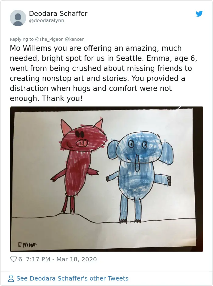 “I know a lot of you guys are not in school,” Mo Willems said in the introductory video. “You’re at home right now because of all the things that are going on. Well, guess what? I’m at home, too. We’re gonna hang out together.”