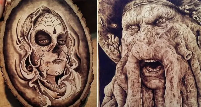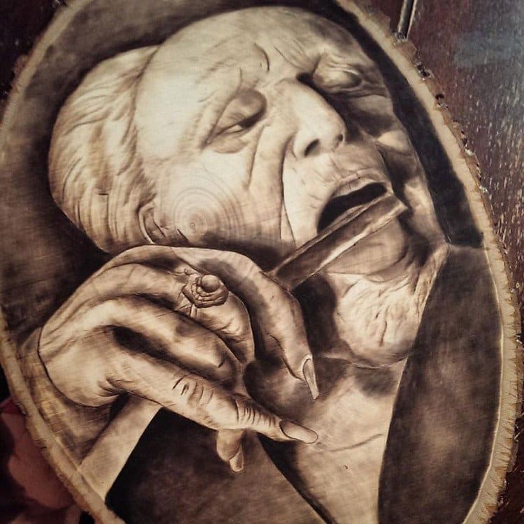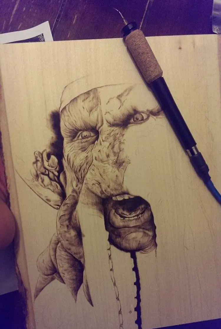 Rick Merian is a pyrographer which means that he produces art through the burning of wood with special tools. If you've never seen heat used on wood to make pictures then you're in for a real treat as his works are amazing. Merian has only been working with this medium for a few months and you would never know as he already seems like an expert. The artist loves watching movies and tattoo artwork and incorporates both into his pieces. Check these out!