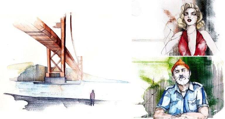 It's no secret that we're fans of Juli Jah here at Awesome Inventions. We've previously featured the German artist's music-inspired illustrations, and her wonderful paintings of foxes. Now she's back with some gorgeous watercolor and ink creations inspired by various movies. Juli was commissioned by The Grand in Berlin to create these illustrations to go in their drinks menu. Since their signature cocktails are named after movies or movie characters, it only made sense that the illustrations match up. These paintings are truly stunning… we'd love to have some of them up on our walls.