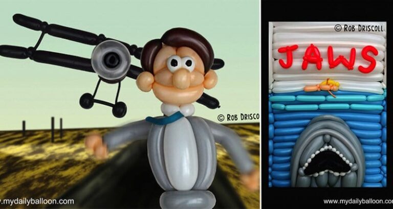 If you've got a talent, you should certainly use it. But, what if your talent is making balloon animals, balloon people, and other assorted balloon things? Why, we suppose your best option is to become a balloon artist. That's exactly what Rob Driscoll decided to do with his life, and from the looks of it, he's doing very well. One of his recent projects is called "Twisted Cinema" and what Driscoll does is use his balloon manipulating skills to recreate either famous movie posters or iconic scenes from movies, such as that scene from Mission Impossible (you know the one…Tom Cruise comes down from the ceiling on a bit of string, or whatever). Driscoll's colorful balloons-meet-movies art is a delight to behold, in a whimsical yet surprisingly accurate way. He is in the process of completing one of these twisted cinema pieces each week for a whole year, so you can catch up on his website if you like what you see below.