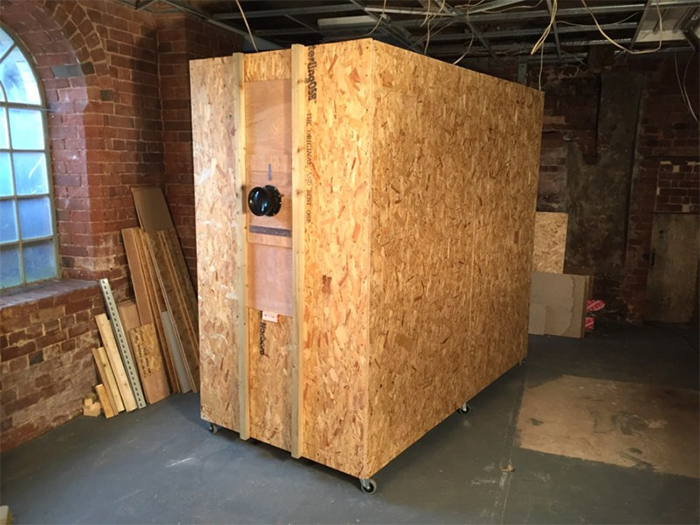 Barry bought an old camper trailer off eBay for £150 (about $200), gutted it, blacked it out and repainted it. He then built a mount for the lens and set up the space for the darkroom trays. To test it out, he got permission from a local pop up art space to park his giant camera for a week.