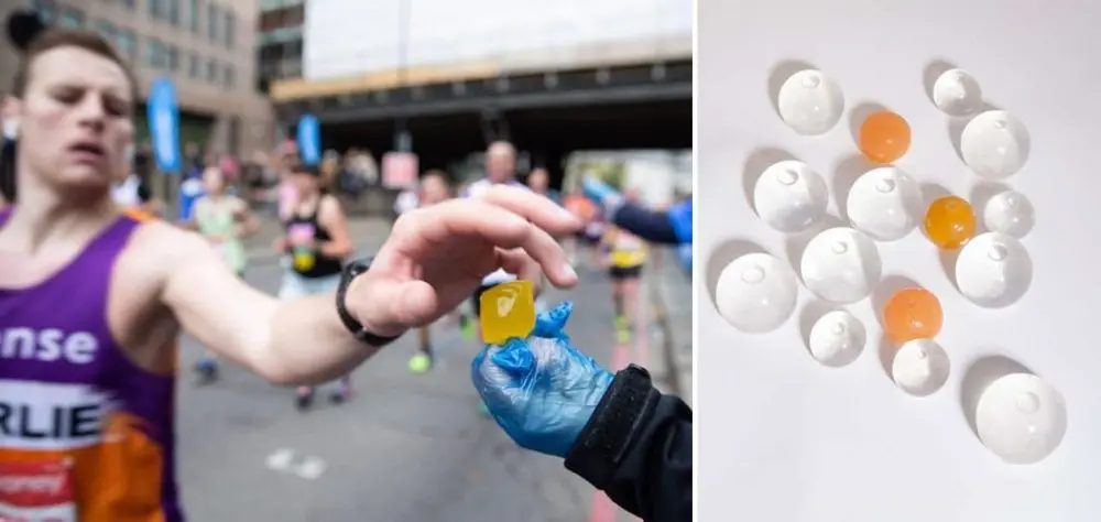 Ooho pods filled with Lucozade Sports Orange were handed out to runners during the 2019 London Marathon