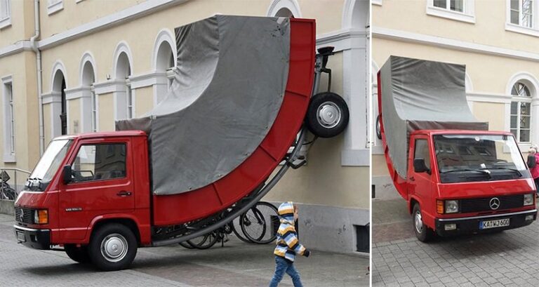 Parking officers in the German city of Karlsruhe got a bit heavy and serious recently, slapping a 30 euro parking ticket on a cool art installation. The installation, by Austrian artist Erwin Wurm, takes the form of a bent red Mercedes MB100D truck, its rear end sloping up a wall. Wurm is famous for his bent vehicle pieces and he had been commissioned to create this one in celebration of the city's 300th birthday celebrations. The artist says the truck was distorted into its unusual shape to show the "mundane from a different perspective". There's nothing more mundane than getting a parking ticket! We hope Wurm gets off the fine upon appeal!